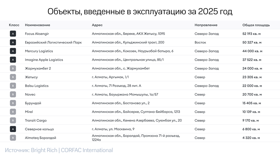 In 2025, a total of 320,000 sq. m of warehouse real estate was commissioned in Almaty city and the Almaty region, marking the highest figure in the market’s history, according to estimates by Bright Rich | CORFAC International. Compared to 2024, the volume of newly delivered space increased 3.5 times.