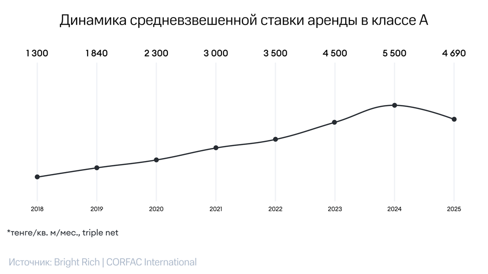 The average rent for Class A warehouses in 2025 declined by 15% year-on-year to KZT 4,700 per sq. m per month. Rental rates for Class B properties decreased by 12%, down to KZT 3,900 per sq. m per month.
