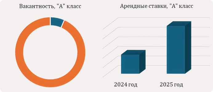 - Арендные ставки по классу A выросли в среднем на 12–15% по сравнению с аналогичным периодом 2024 года.