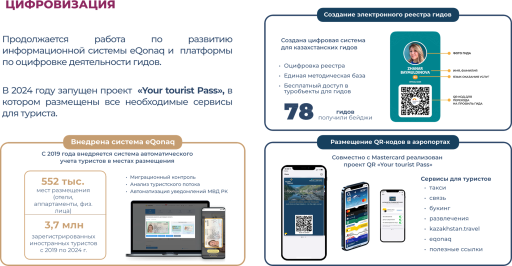 Система eQonaq помогает собирать данные о туристах, включая пол, возраст и цели их визита. За год система охватила 1,5 млн туристов. Также была создана система для сертификации казахстанских гидов, что способствует улучшению качества обслуживания туристов. В 2024 году был запущен проект «Your Tourist Pass», виртуальная карта, предоставляющая доступ к услугам такси, eSIM и другим полезным ресурсам.