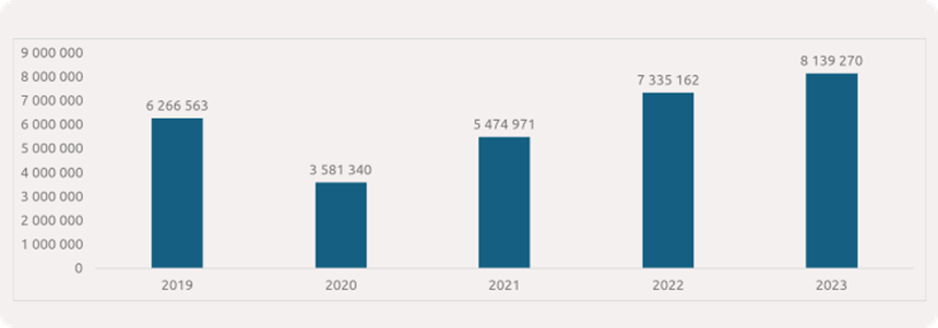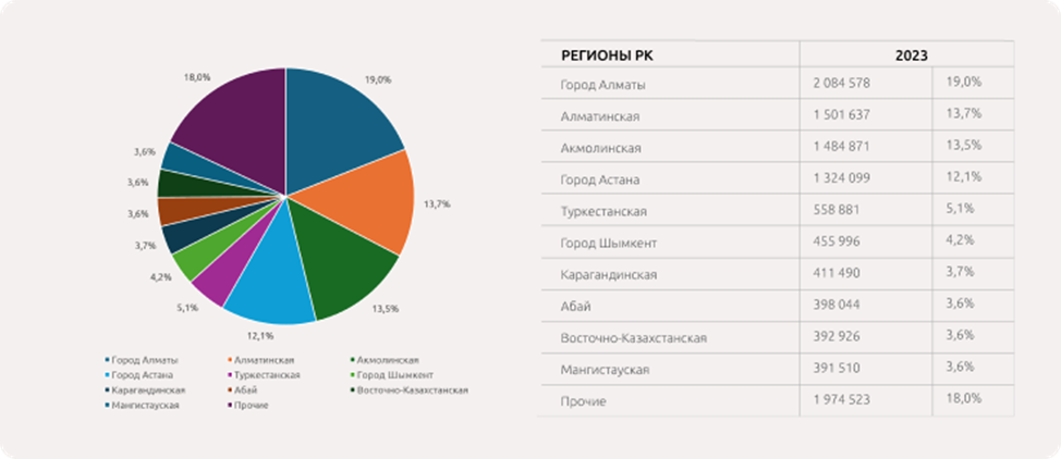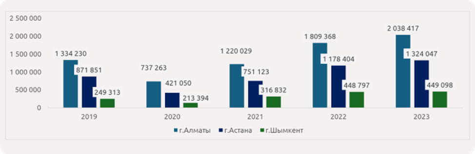 С 2019 по 2023 год количество обслуженных посетителей в местах размещения в Республике Казахстан значительно выросло с 6,2 млн. до 8,1 млн. человек, что свидетельствует о восстановлении и росте туристического потока после снижения в 2020 году, связанного с пандемией COVID-19. Наибольший прирост наблюдается в Алматы, где количество посетителей выросло более чем на 700 000 человек, что подчеркивает его важную роль как туристического центра Казахстана. Значительный вклад регионов, таких как Алматы, Алматинская область и Акмолинская область, свидетельствует о потенциале для более равномерного распределения туристических потоков при дальнейшем развитии инфраструктуры и продвижении локальных туристических направлений. Таким образом, текущая динамика формирует устойчивую основу для привлечения инвестиций в гостиничную недвижимость, стимулирует развитие региональных туристических кластеров и укрепляет позиции Казахстана как перспективного туристического направления.
